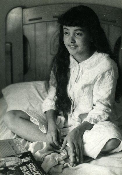 school. Reads Lewis Carroll, becomes Alice in Wonderland (through